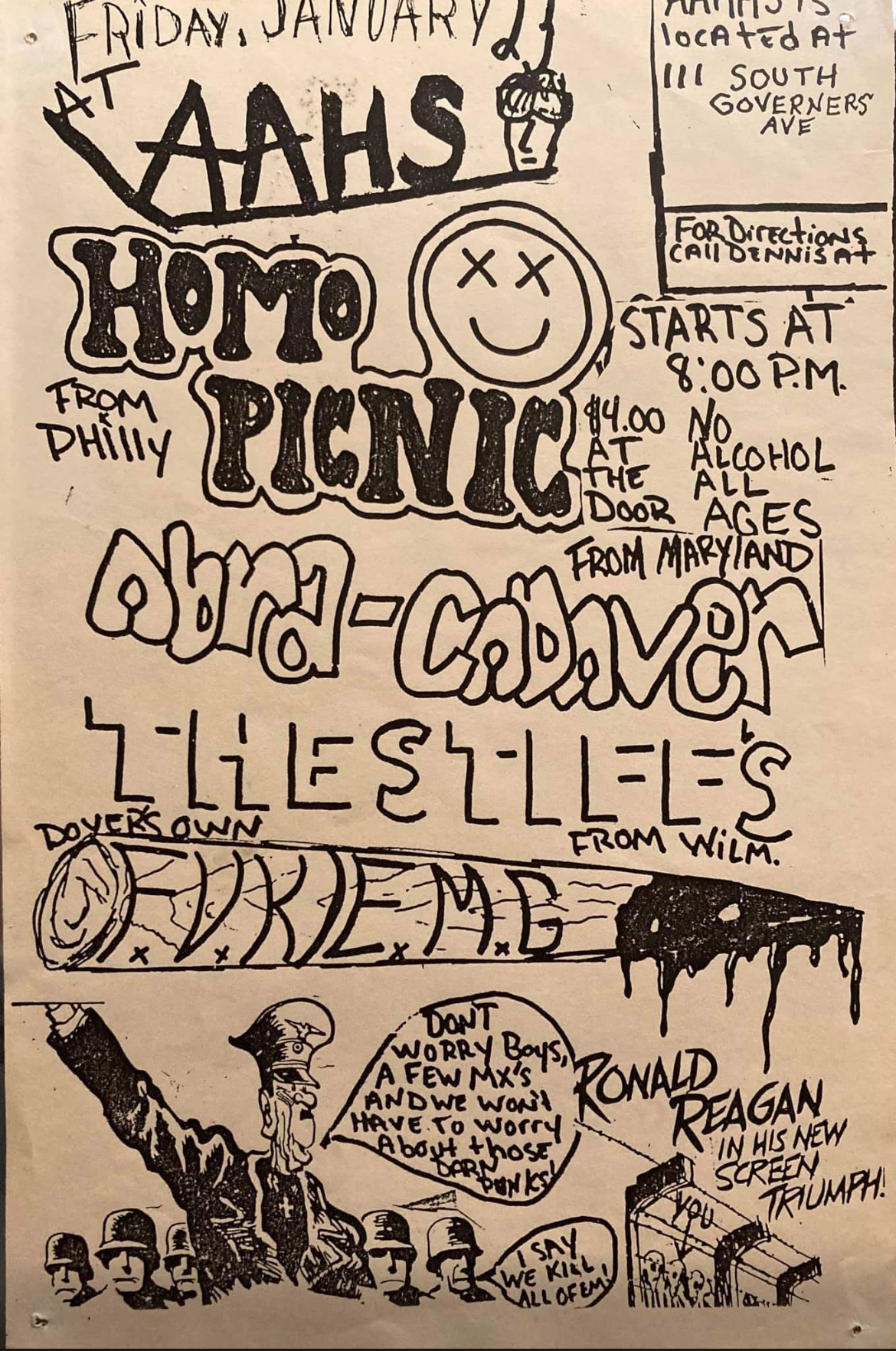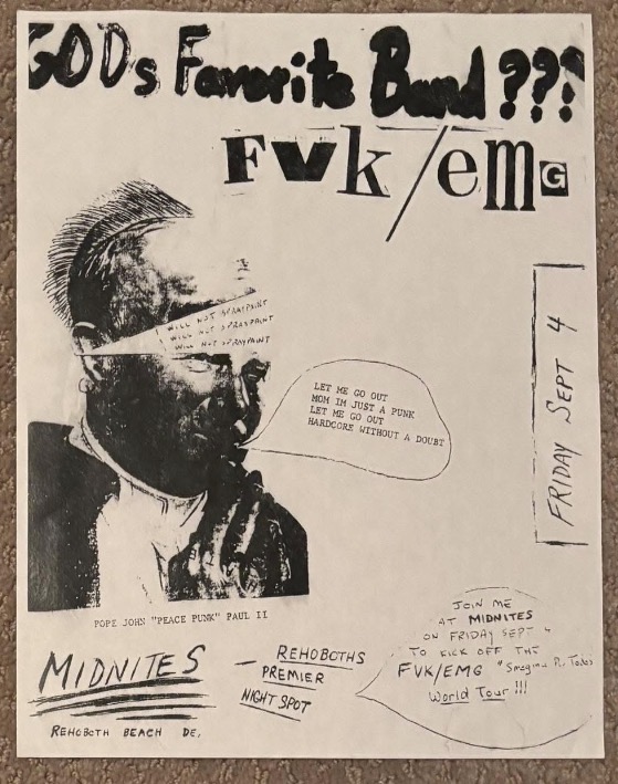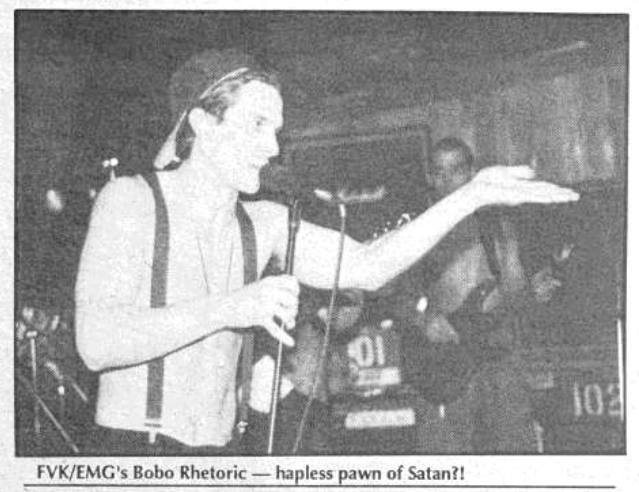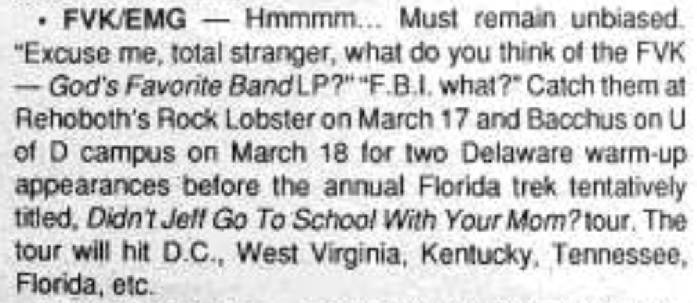 Likely Delaware's first punk band to tour outside the mid-Atlantic region, FVK/EMG started out as a two-piece with Jeff Lydon on guitar and Bobo Rhetoric on vocals in 1986 in Milford, DE "to get on everyone's nerves." Challenging northern Delaware's presumption as the cultural center of the state, FVK was very connected to the Maximum Rocknroll DIY world and had ties to Kamala Parks’ Book Your Own Fuckin’ Life booking system, which brought national acts to rural central/southern Delaware. FVK's eventual sound was inspired by sounds like Dead Kennedys but with the DK's overt political focus swapped out with some renegade Delaware mischief. Putting out their sole LP in 1988, FVK toured down to Gainesville, Florida and played with Operation Ivy during their only tour. The following year, they hosted shows for Bay Area bands such as Neurosis and Mr. T Experience at their “Psychedelic Love Ranch” band house. Members would go on to play in Carnal Ghia, work with GWAR, and own the long time New York bar institution, Beauty Bar.
