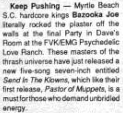Bazooka Joe (South Carolina) mention playing F.V.K. house Maximum Rocknroll 079, Dec. 1989