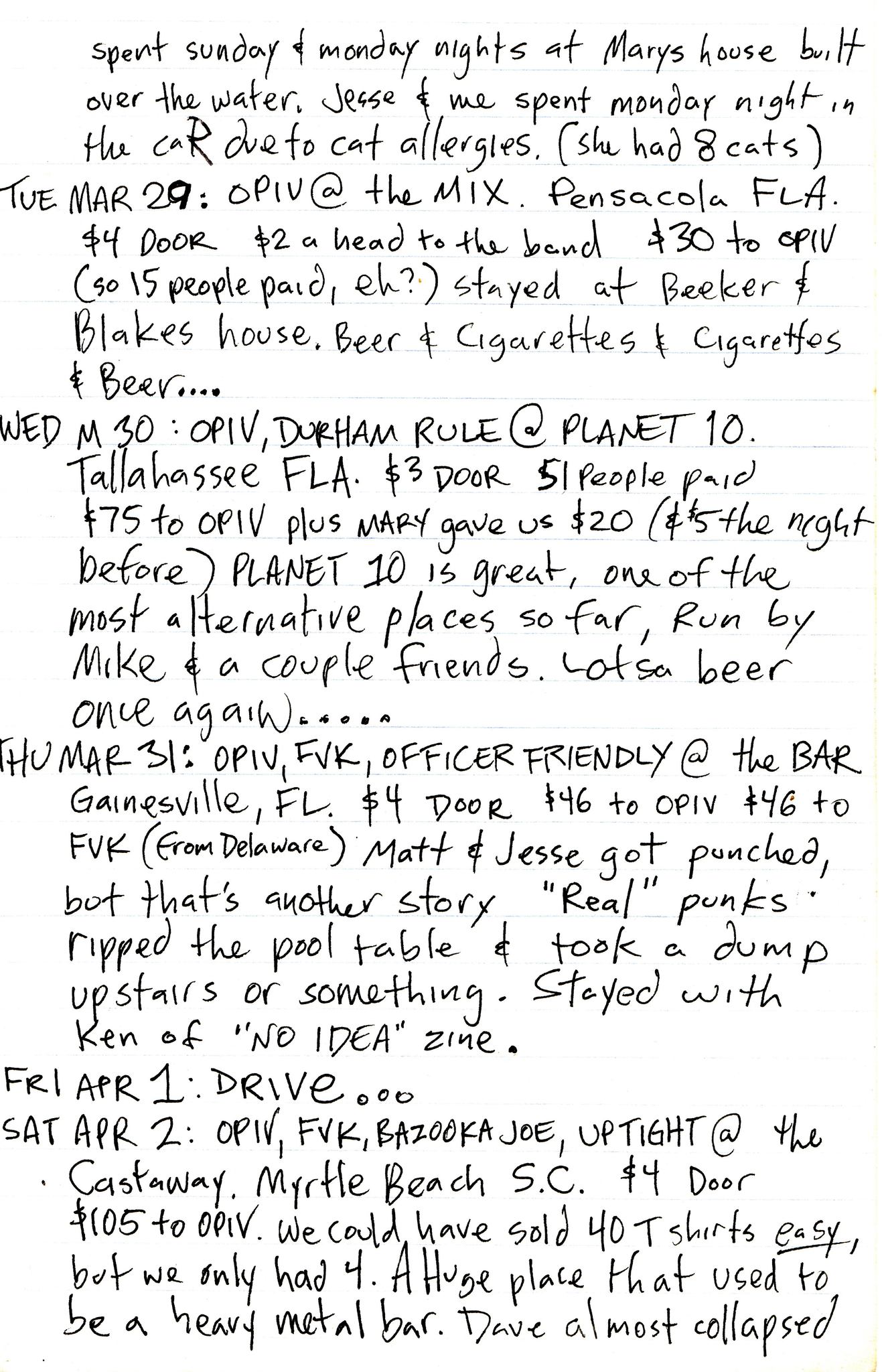 David Hayes (MRR/Gilman, Lookout Records, Very Small Records) tour diary while roadie-ing for Op Ivy