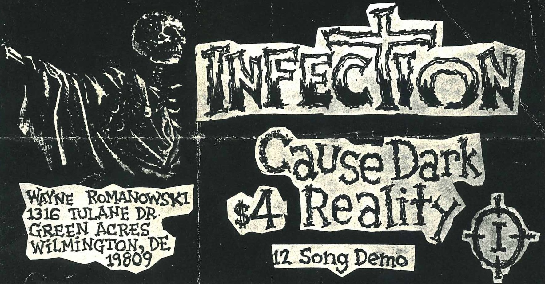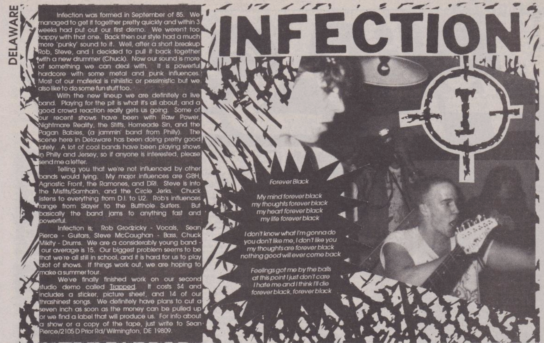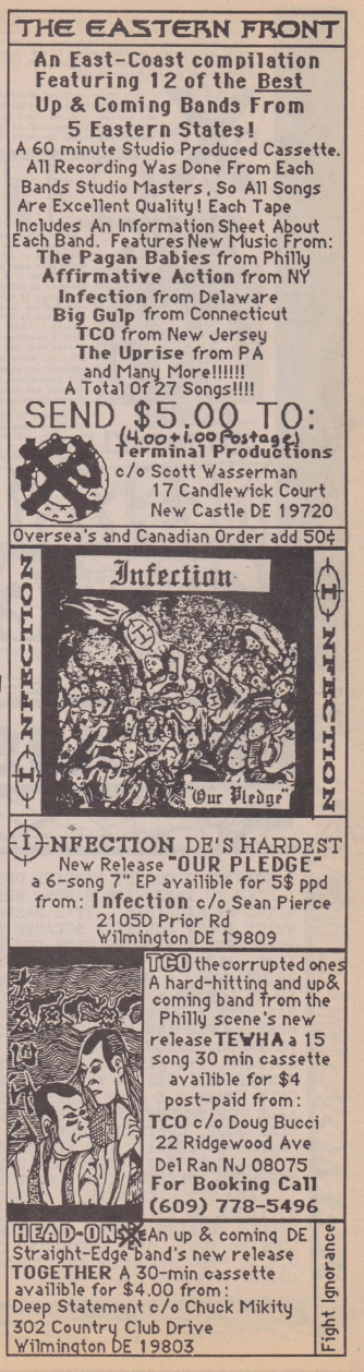 Infection was an outfit from Wilmington (Delaware) that played powerful crossover hardcore “with some metal and punk influences”. The band consisted of Sean Pierce (guitar), Victor George (vocals), Steve ‘Slammo’ McCaughan (bass) & Chuck Mikity (drums) – they were 14-16 years old. The person who ‘produced’ it was Wayne Romanowski (All The Rage skate zine). In an interview the guitarist mentions ‘G.B.H.’, ‘Agnostic Front’, ‘Ramones’ & ‘D.R.I.’ as his early influences, later ‘Cro-Mags’, ‘Gang Green’, ‘Metallica’ & ‘Murphy’s Law’. Vinyl-wise they did the Our Pledge 7″ (’88) and the Legal Limit LP (’89). They had five demos out in total, a couple of tracks on the Delaware Hardcore Compilation tape and a split-tape with ‘Morbid Life’.