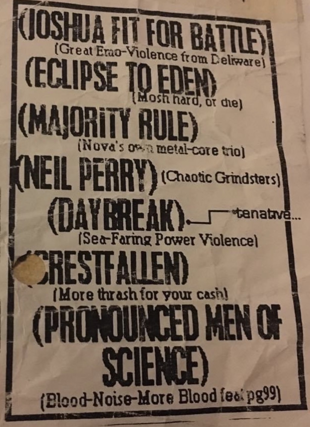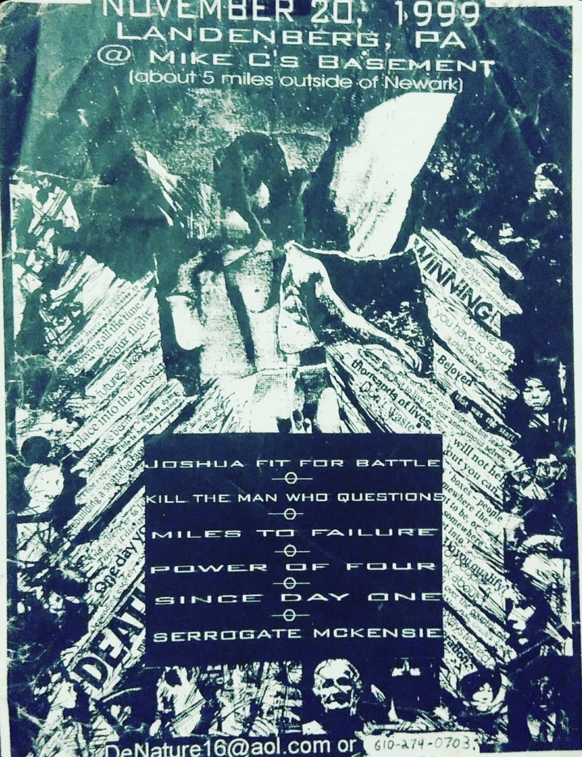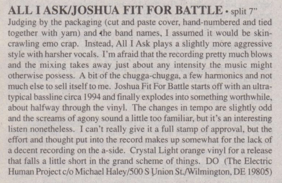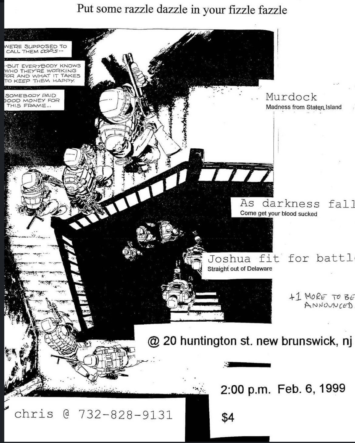 In 1998, Danny Bogart, Kevin Hardy, Larry Everett and Joe Breitenbach were on a bowling team called "The Slayers" in the Newark Shopping Center bowling alley. Deciding they might have a band on their hands, they teamed up with Justin Gilday and Geoff Matheson, who were more interested in guitars than bowling balls, and Joshua Fit For Battle was formed. Their first show was booked in 1998 by DMHA co-founder Chris Haug and Electric Human Project label baron Mike Haley at the Ashley Circle VFW in Wilmington, DE. Early the next year, John Fasano replaced Justin Gilday on guitar. With drummer Kevin Hardy relocating to Michigan about a year after their first show, JFFB played their (intended) final show on May 15, 1999, in Newark, DE.