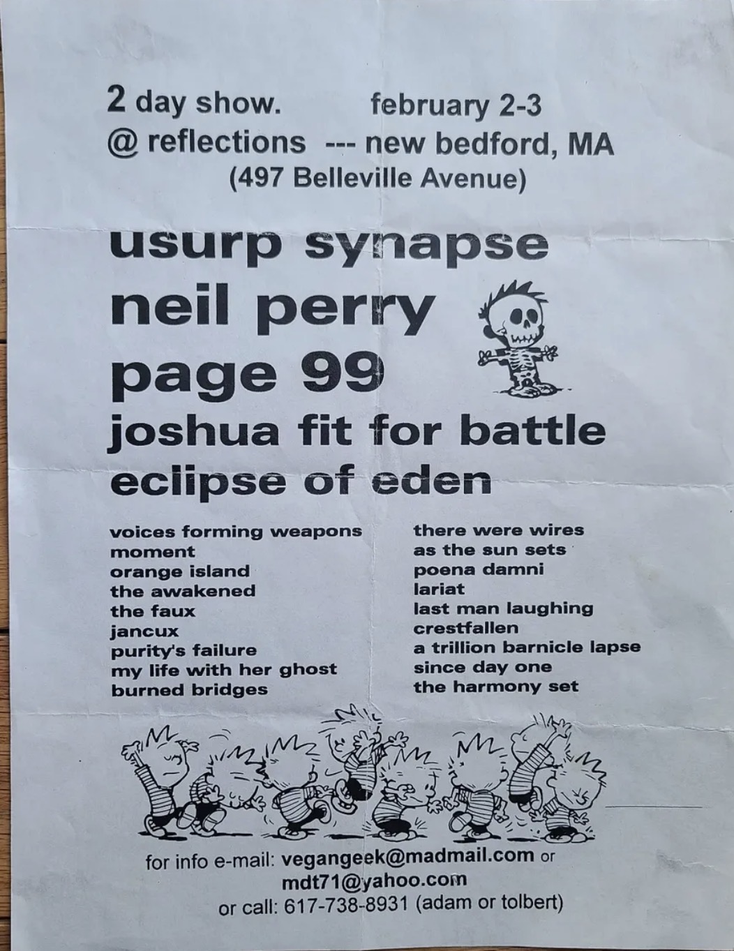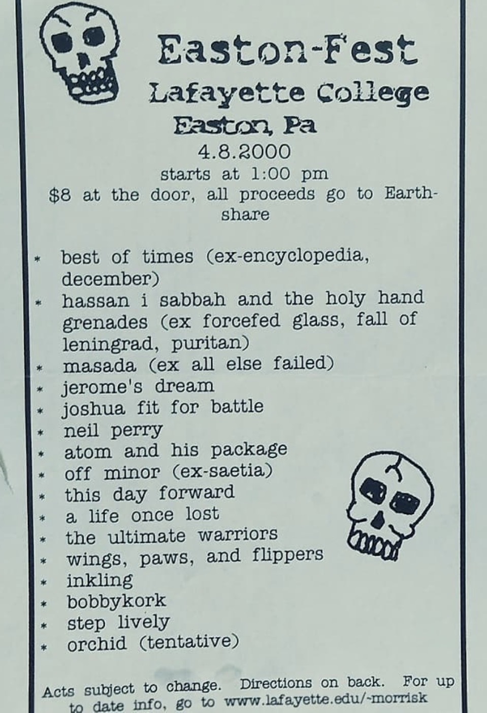A breakup ended up being a roughly 8-month hiatus after Kevin Hardy returned to Delaware, and with some personnel changes, the band picked back up where they left off. While reconfiguring, the band swapped in Josh Jakubowski for John Fasano on guitar, in time for JFFB's split with Josh's band Neil Perry. In spring of 2000, Joe and Geoff had left the band and played a few shows as a four piece, including one show with Bane and Boysetsfire in Philadelphia.